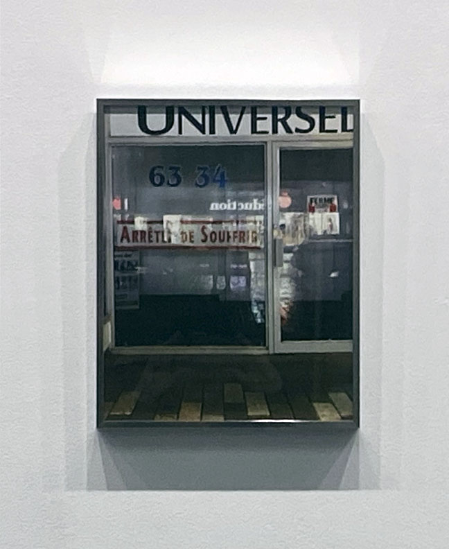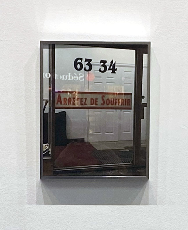 “I [wish to] Know Everything, activates the gallery vitrine through a time-based juxtaposition of ten photographs. Melanson’s proposition interchanges a single image based on gallery hours. The photographs are of the facing storefront windows of a church and a sex shop, where their signage appears in each other’s reflection. Melanson creates a third overlapping of these linguistic images, situating the viewer at the liminal space within the institution, that is between the gallery and university lobby.”