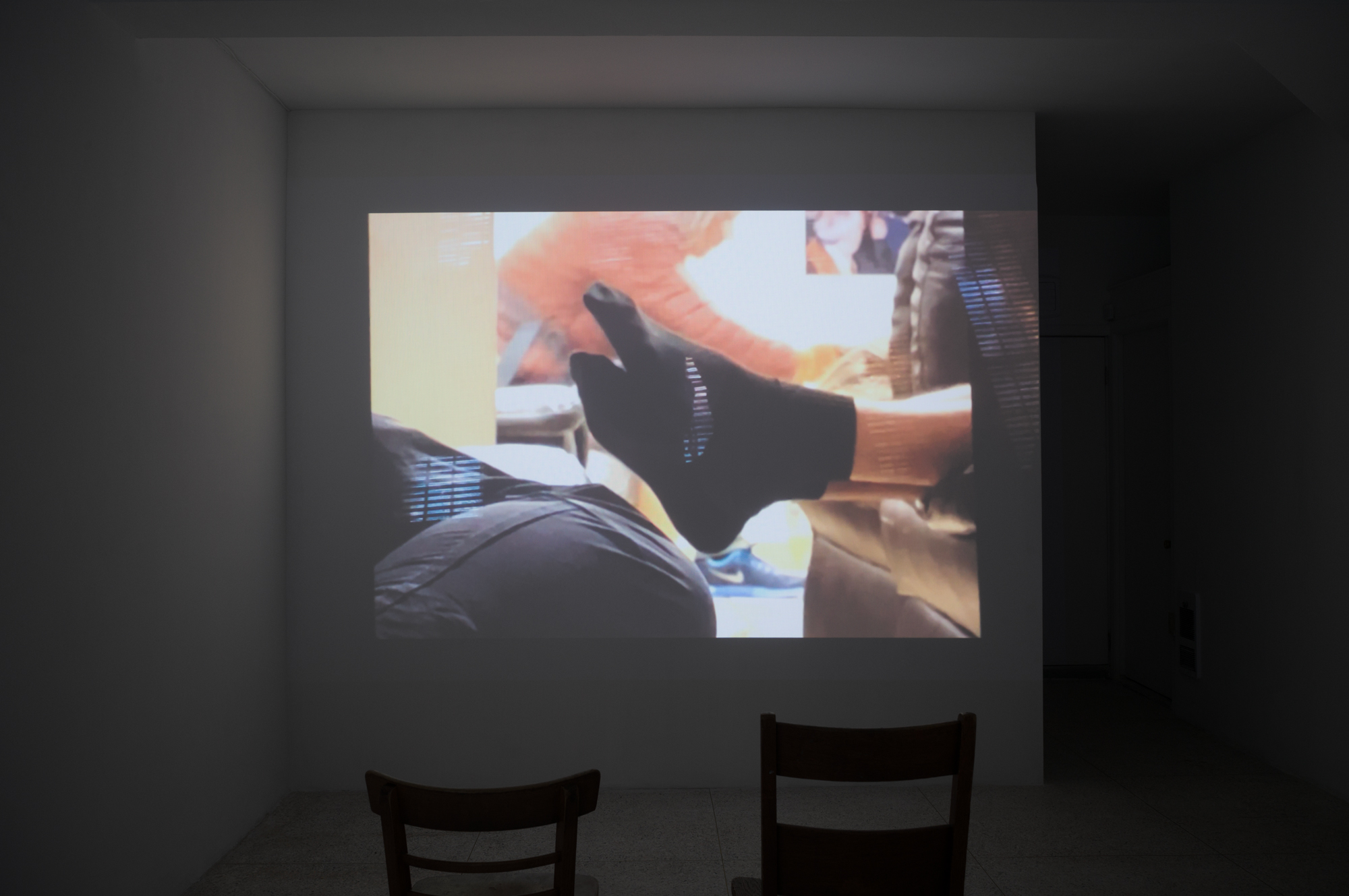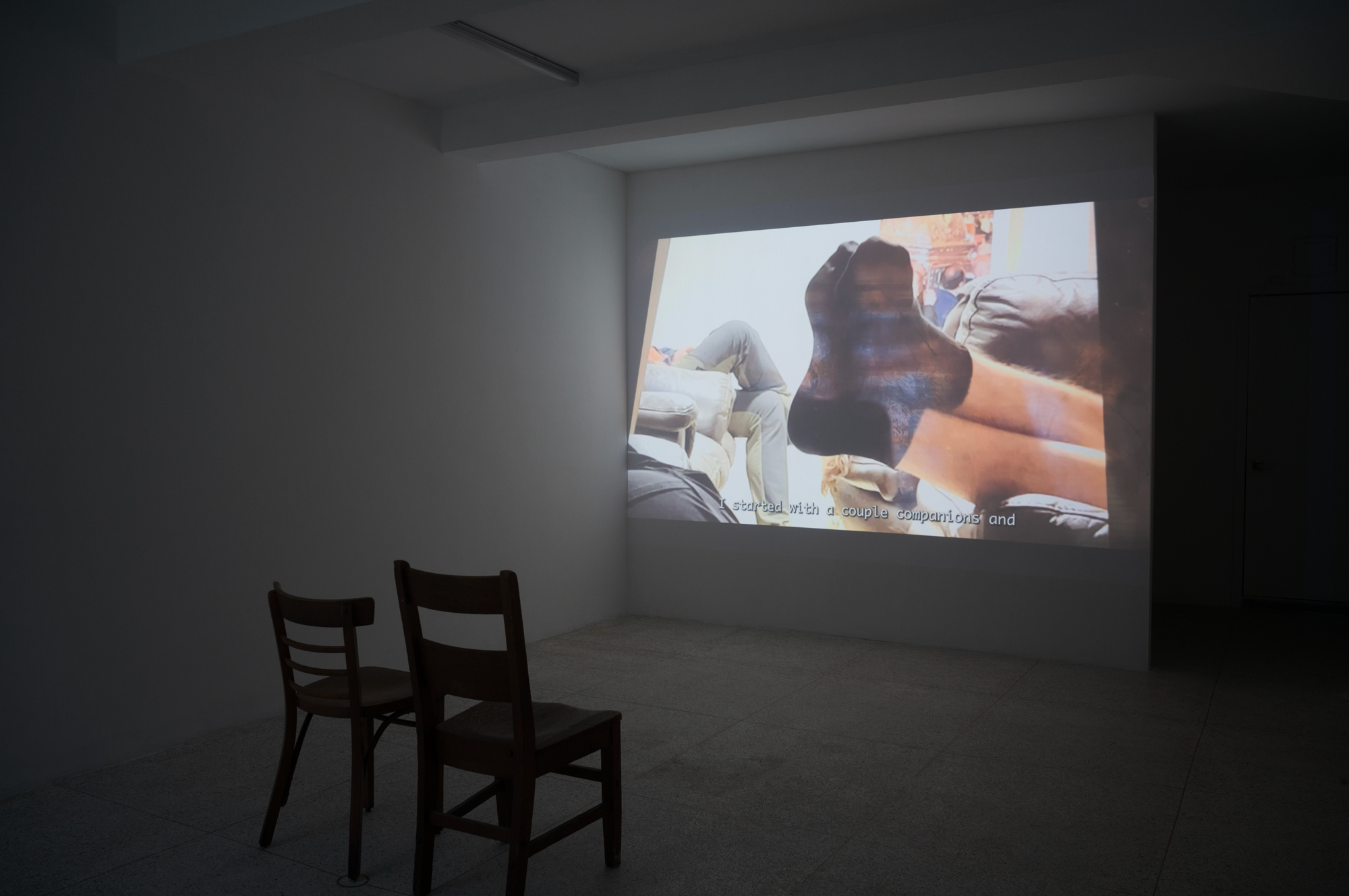 In One Foot in Front of the Other, 2024-2026, Alli Melanson revisits material taken during her time walking the Camino de Santiago. The footage was taken about halfway through the walk in a hostel lounge area with couches where guests would gather, where she quietly documents two people – one trying to relieve the pain of the other from injuries incurred while walking. They appear to be strangers, their timid conversation playing out across subtitles, as they negotiate with one another asking more or less, "does this hurt?". Melanson’s somewhat voyeuristic position is partially eclipsed by a pair of feet that do their own kind of dance, progressively relaxing into sleep. The videos are refilmed with a phone camera horizontally, creating another layer of removal and duplicating her point-of-view, this time from inside her bedroom a year and a half later.
